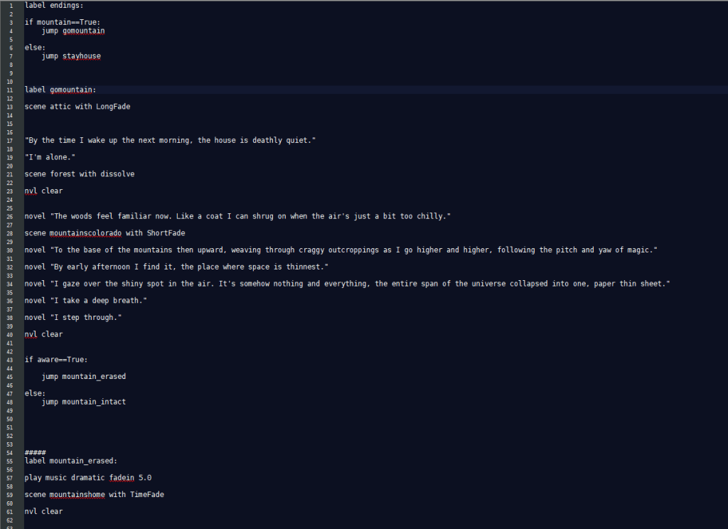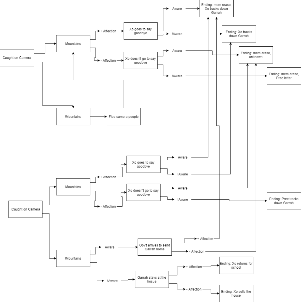For The Center of the Universe, a cascading choice system was used to determine which ending the player received. While, programmatically, it required addressing the variables in a different order than the narrative flow, the overall intention was achieved in the end.