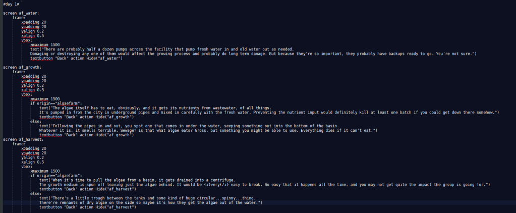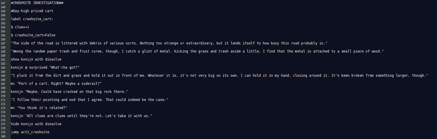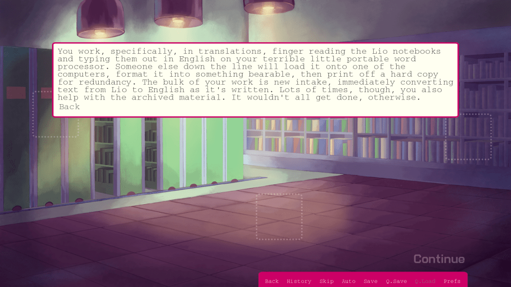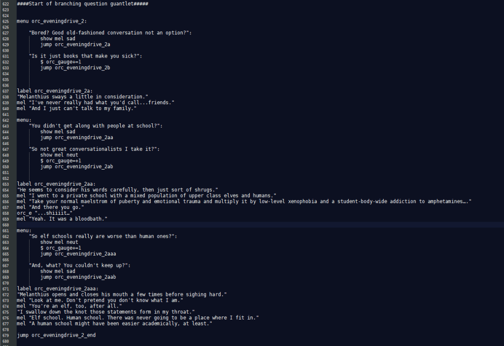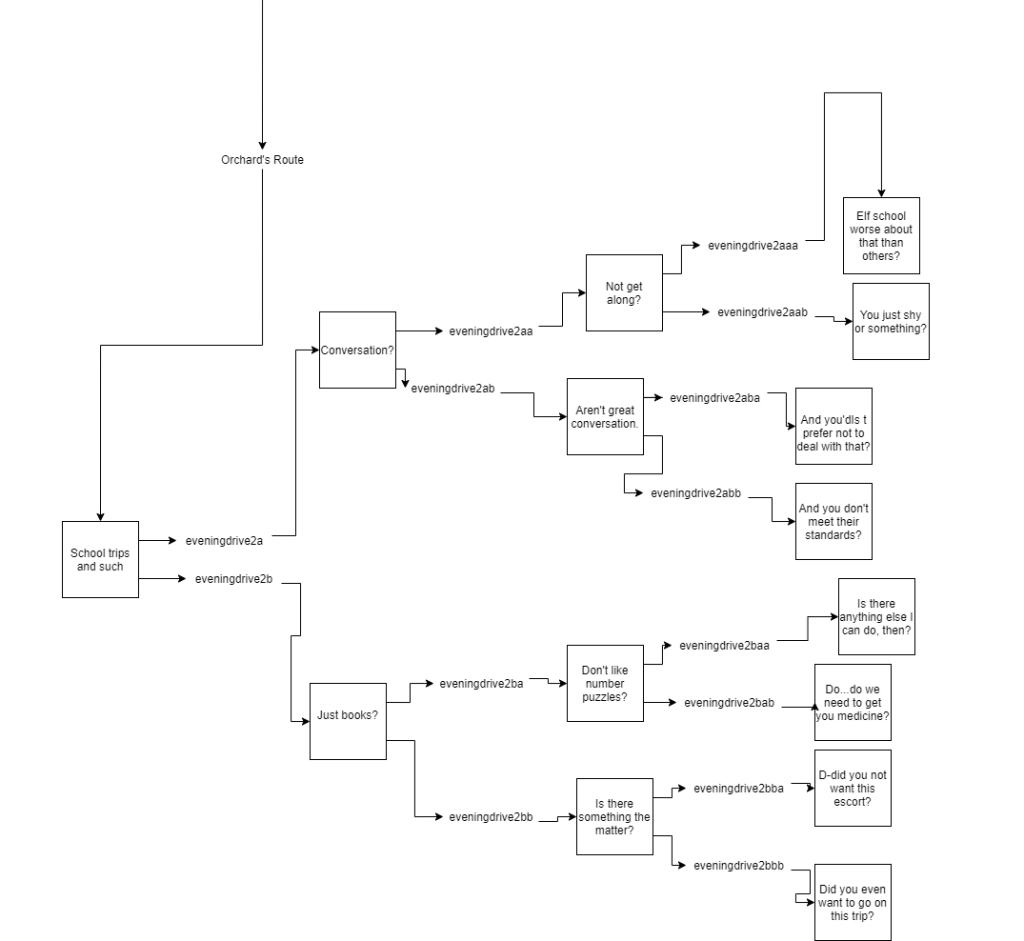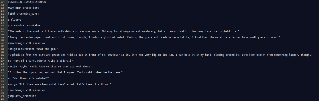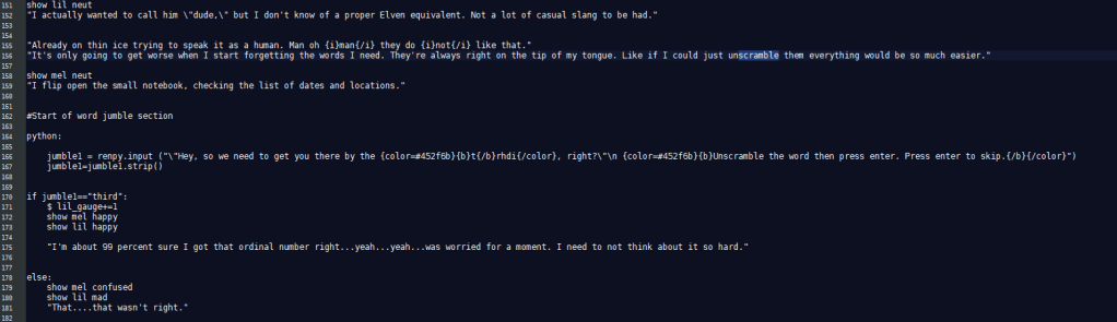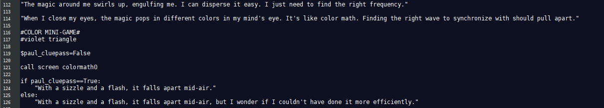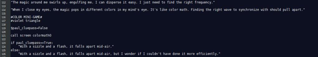 In Lilah’s route of Hart Connection, he’s unable to speak the language of his companion effectively. Word scrambles and mad libs were used to replicate this. For Paul in Hart of the Matter, color math represented magic and effected his language around conversations about magic. The Terrible Persistence of Memory featured extensive point and click segments used to mimic investigation.